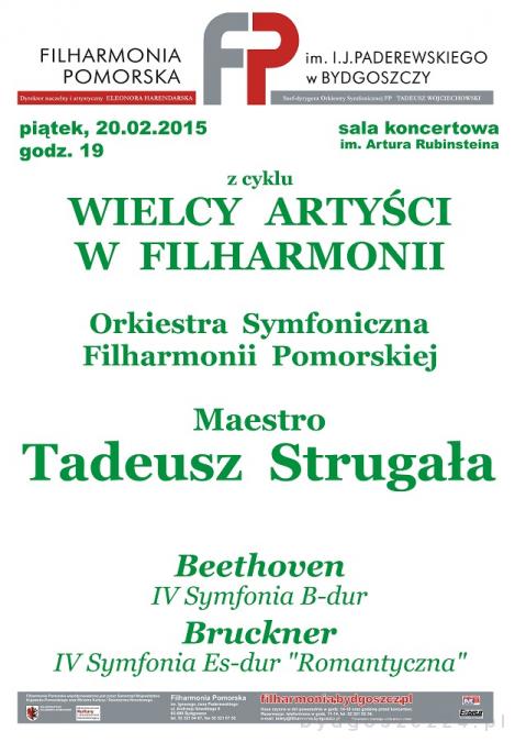 Tadeusz Strugała, wybitny dyrygent, pedagog, juror i organizator życia muzycznego, poprowadzi kolejny koncert spektakularnego cyklu ?WIELCY ARTYŚCI W FILHARMONII?. Koncert pod batutą Maestro wypełnią wielkie dzieła literatury muzycznej: Ludwiga van Beethovena heroiczno-patetyczna w charakterze, ale przemawiająca pogodną muzyką IV Symfonia B-dur, jedno z mniej znanych dzieł wielkiego klasyka, jednakże zdobywające coraz więcej zwolenników oraz Antona Brucknera IV Symfonia Es-dur mająca przydomek ?Romantyczna?, pełna liryzmu, opiewająca romantykę i piękno przyrody: wspaniałość pól i lasów, nieba i słońca.