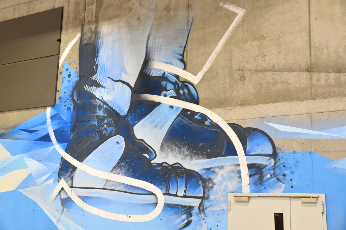- Kompozycja muralu uwzględnia pozostawienie istniejących fragmentów betonowych ścian, dzięki czemu praca jest spójna z całym obiektem. Dobrze też wpisuje się w jego charakter – stylistycznie i formalnie. Bryły tworzą przestrzeń, która kojarzy się z bryłami lodu – wyjaśnia Marek Iwiński, plastyk miasta.