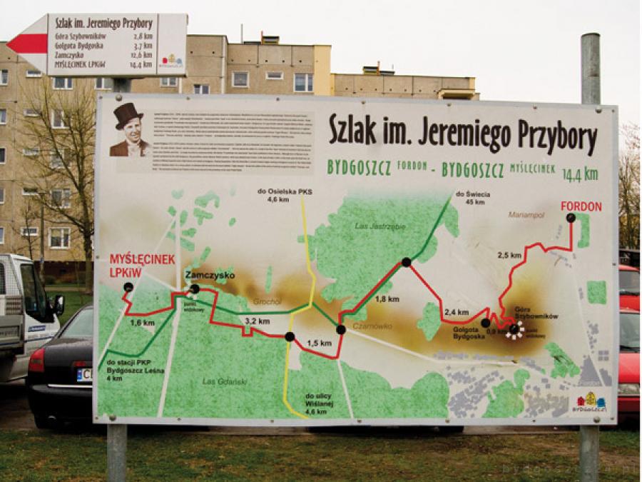 Na początku robimy zdjęcie samej tablicy. Dziarskim krokiem ruszamy chodnikiem wzdłuż Pelplińskiej. Szybko znajdujemy ul. Kromera i skręcamy w nią, by dojść do Beskidzkiej. Wkraczamy tym samym ?na górki?, pomiędzy mokre drzewa i śliskie, błotniste ścieżki. Przygoda się zaczyna. Podczas spaceru zastanawiam się, co ma wspólnego Jeremi Przybora z Bydgoszczą? Co takiego znany polski poeta i pisarz, jeden z współtwórców ?Kabaretu Starszych Panów? i ?Kabaretu Jeszcze Starszych Panów? mógłby mieć wspólnego z naszym miastem? Okazuje się, że całkiem sporo i to w bardzo pozytywny sposób. Jeremi Przybora jest artystą znanym i docenianym. Jego piosenki z kabaretu są współcześnie nagrywane przez takie sławy jak: Maciej Maleńczuk, Paweł Kukiz, Kayah, Renata Przemyk czy Ewelina Flinta.
