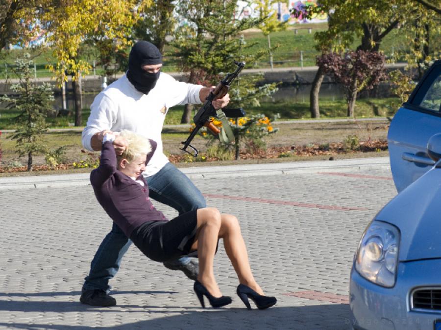 Uciekający przed pościgiem policyjnym bandyci po napadzie na bank wjechali w ślepą uliczkę. Wcześniej wzięli zakładniczkę. Otoczeni przez policjantów rozpoczęli wymianę ognia. Gdy skończyła się porywaczom amunicja, oddział antyterrorystyczny ruszył do natarcia. Po huku rzuconych granatów, policjanci otoczyli przebywających w samochodzie przestępców. Po obezwładnieniu porywaczy sprawdzili zawartość bagażnika, odnajdując zrabowane pieniądze. Po zabezpieczeniu terenu na plan wjechała karetka, niosąc pomoc poszkodowanej zakładniczce. Po umieszczeniu i unieruchomieniu ofiary na noszach, służby ratownicze przewiozły poszkodowaną do szpitala. Uczestnicy konferencji z zapartym tchem śledzili pokaz przygotowany przez Komendę Miejską Policji w Bydgoszczy, opatrzony kryptonimem: “Sytuacja zakładnicza”.