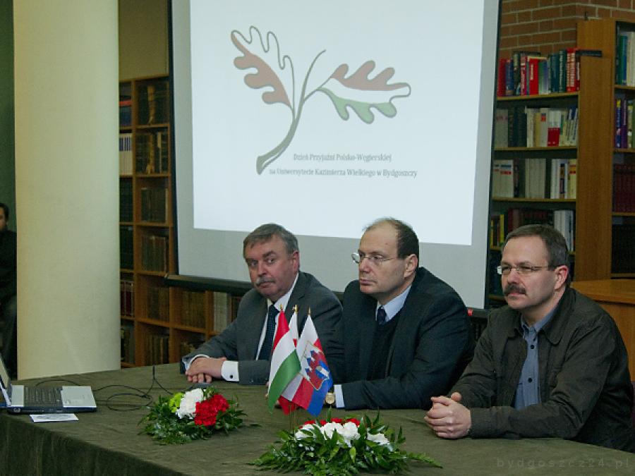 Na dzisiejszej uroczystości obecni byli dr Janos Tischler, dyrektor Węgierskiego Instytutu Kultury w Warszawie, dr hab. Roman Leppert, prorektor UKW, Jan Szopiński, zastępca prezydenta Bydgoszczy i Marek Pietrzak, który wkrótce pełnić będzie obowiązki konsula honorowego w naszym mieście. W części oficjalnej przypomniano szczególne więzi łączące Polaków i Węgrów, wspólne losy, wspólnych bohaterów m.in. króla Stefana Batorego, przewódcę powstania węgierskiego Józefa Bema, a studenci odśpiewali hymny obu państw.