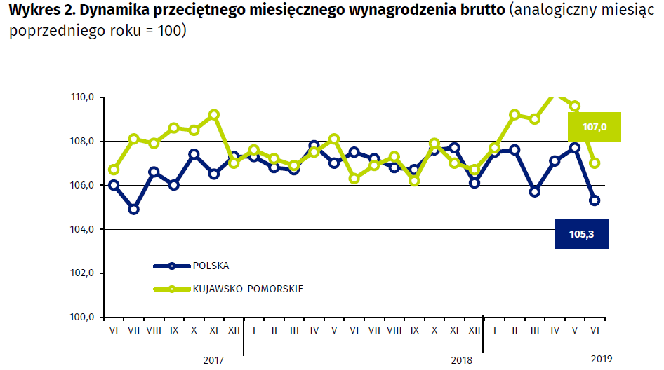 Niepokojące dane za czerwiec 2019 roku podał Urząd Statystyczny w Bydgoszczy i GUS. Przeciętne miesięczne wynagrodzenie brutto w sektorze przedsiębiorstw było niższe niż miesiąc wcześniej, inflacja zbliżyła się do 3%, a produkcja przemysłowa spadła o ponad 2%.
