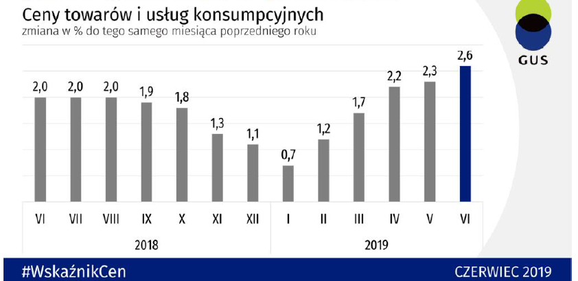 W czerwcu 2019 r. inflacja wzrosła piąty miesiąc z rzędu. Ceny towarów i usług konsumpcyjnych w czerwcu 2019 r. w stosunku do poprzedniego miesiąca wzrosły o 0,3% (w tym usługi – o 1,0%, przy utrzymujących się na tym samym poziomie cenach towarów). W porównaniu z analogicznym miesiącem ub. roku ceny towarów i usług konsumpcyjnych wzrosły o 2,6% (w tym usług – o 3,9% i towarów – o 2,2%).