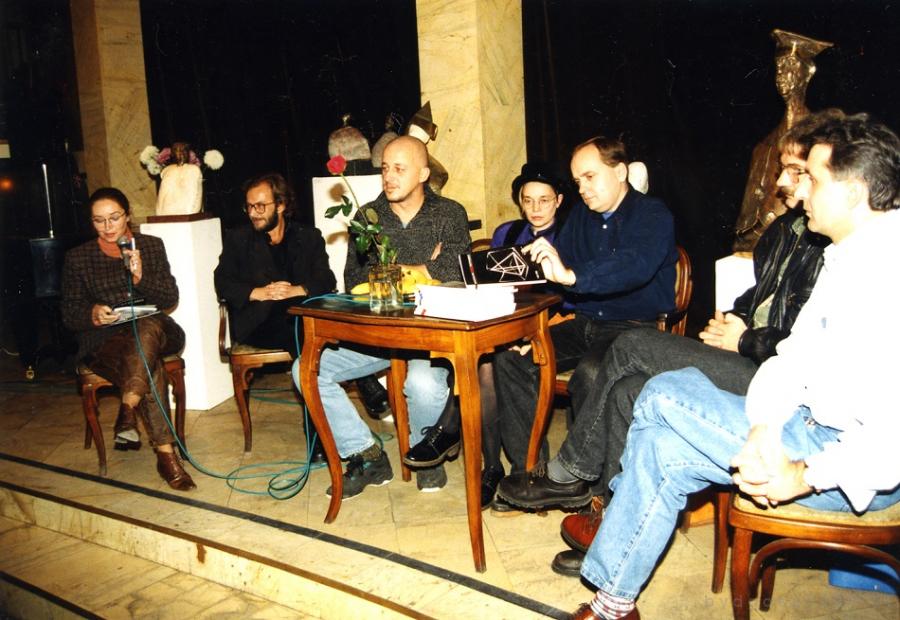 KWARTALNIK ARTYSTYCZNY – REDAKCJA ROK 1995 (już bez ex-naczelnej Krystyny Starczak-Kozłowskiej i prof. Roberta Mielhorskiego). Na zdjęciu widać dyrektor MOK Krystynę Bujak, która prowadzi spotkanie w kawiarni artystycznej Węgliszek, Ryszard Częstochowski – kierownik działu prozy, Wojciech Zamiara (plastyk, szata graficzna -Sopot), Jola Ciesielska (krytyk sztuki, dział plastyka – ŁÓDŹ), Krzysztof Myszkowski (naczelny), Grzegorz Musiał (dział eseju) i Józef Baliński (Opera, dział muzyka). Obecnie pismo jest redagowane bez kolegium redakcyjnego, w zasadzie jest sterowane jednoosobowo. Stopka zespołu to tylko ozdoba, czyli przysłowiowy kwiatek do kożucha. W tle rzeźby Michała Kubiaka, którego prace prezentowaliśmy w numerze próbnym. (r.cz.)