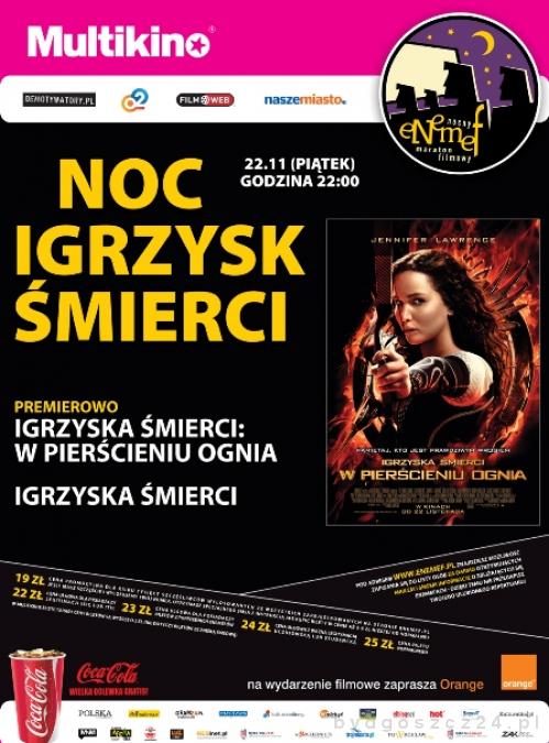 W nocy z 22 na 23 listopada uczestnicy ENEMEF-u: Noc Igrzysk śmierci zobaczą dwa filmy z wciągającą fabułą, świetnymi efektami specjalnymi oraz wyrazistymi bohaterami, w których wcielają się doskonali aktorzy. Pierwsza część ?Igrzysk śmierci? odniosła ogromny sukces i zdobyła rzesze fanów na całym świecie, a druga część serii to jedna z najbardziej wyczekiwanych premier tego roku. W repertuarze znalazły się: ?Igrzyska śmierci: W pierścieniu ognia? (premierowo) oraz *?Igrzyska Śmierci?. Zostaną one wyświetlone chronologicznie.