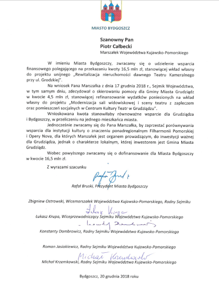 Zgodnie z zapowiedzią złożoną podczas konferencji prasowej z 18 grudnia 2018 r. prezydent Rafał Bruski skierował pismo do marszałka województwa Piotra Całbeckiego, w którym zawnioskował o udzielnie wsparcia finansowego w kwocie 16,5 mln zł, jako wkładu własnego do projektu unijnego „Rewitalizacja nieruchomości dawnego Teatru Kameralnego przy ul. Grodzkiej”. Powyższa prośba, jest pokłosiem uchwały sejmiku w sprawie udzielenia na wniosek marszałka, pomocy finansowej dla Grudziądza, na Centrum Kultury Teatr w Grudziądzu. W opinii prezydenta Bydgoszczy udzielenie pomocy dla Grudziądza stało się precedensem, gdyż innym gminom dotąd w ten sposób nie udzielano pomocy.