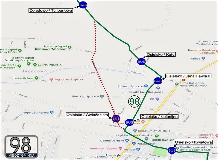 - linia nr 98 zmiana trasy - uruchomienie docelowej stałej trasy przez ul. Jana Pawła II i Kąty w Osielsku. Ulica Słoneczna zostanie wyłączona z obsługi pasażerskiej, tym samy zawieszeniu ulega przystanek Osielsko/Gwiaździsta.