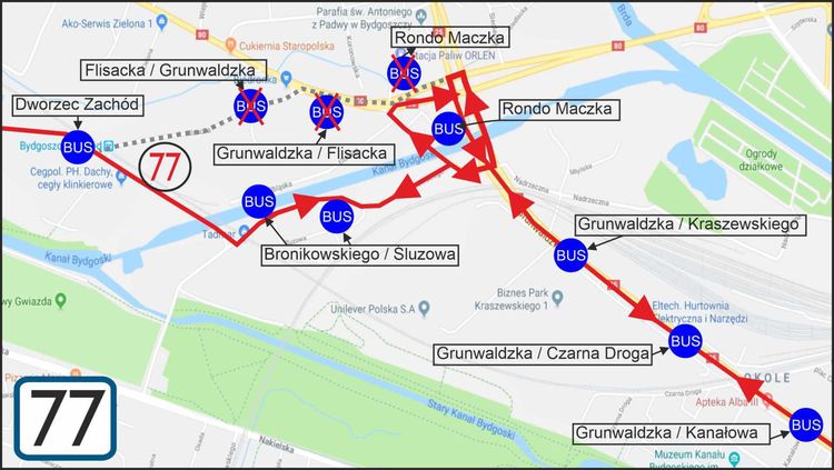 Od poniedziałku trasę zmieni linia nr 77. Autobusy obsłużą też część osiedla Flisy położoną w rejonie ulic Bronikowskiego i Śluzowej, gdzie zlokalizowano dodatkowy przystanek. Przystanek Rondo Maczka (na moście) będzie obsługiwany na tej linii w obu kierunkach jazdy. Warto zwrócić szczególną uwagę na tablice kierunkowe przed wejściem do pojazdu.