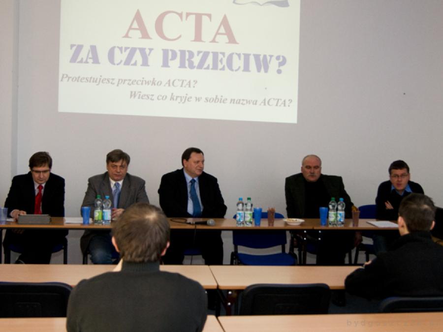 Debata odbyła się w Bydgoskiej Szkole Wyższej. Za stołem usiadło raptem pięciu dyskutantów: radny SLD Jacek Bukowski, poseł PiS Kosma Złotowski, dr Michał Cichoracki, rektor BSW prof. Sławomir Tecław i dr Sławomir Sadowski. Choć formalnie tematem debaty było “ACTA – za czy przeciw”, wszyscy byli przeciw. Z forsującej to rozwiązanie Platformy Obywatelskiej mimo zaproszenia nie przyszedł nikt.