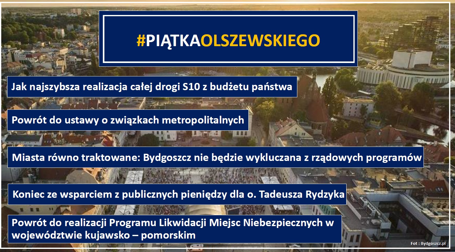Paweł Olszewski podkreślił, że posłowie PiS ani razu nie poparli w trakcie tworzenia budżetu państwa zgłoszonych przez opozycję poprawek zapewniających realizację planowanych w Bydgoszczy inwestycji. Zarzucił, że rząd PiS i obecna większość parlamentarna wspiera jedynie "programy dla wybranych" (miasta wojewódzkie nie otrzymały żadnego wsparcia na budowę mostu, ani też na budowę dróg lokalnych, nie mogą też skorzystać ze środków przeznaczonych na przywracanie lokalnych połączeń komunikacyjnych, żaden projekt Urzędu Miasta Bydgoszczy nie otrzymał wsparcia w ramach projektu "Niepodległa").