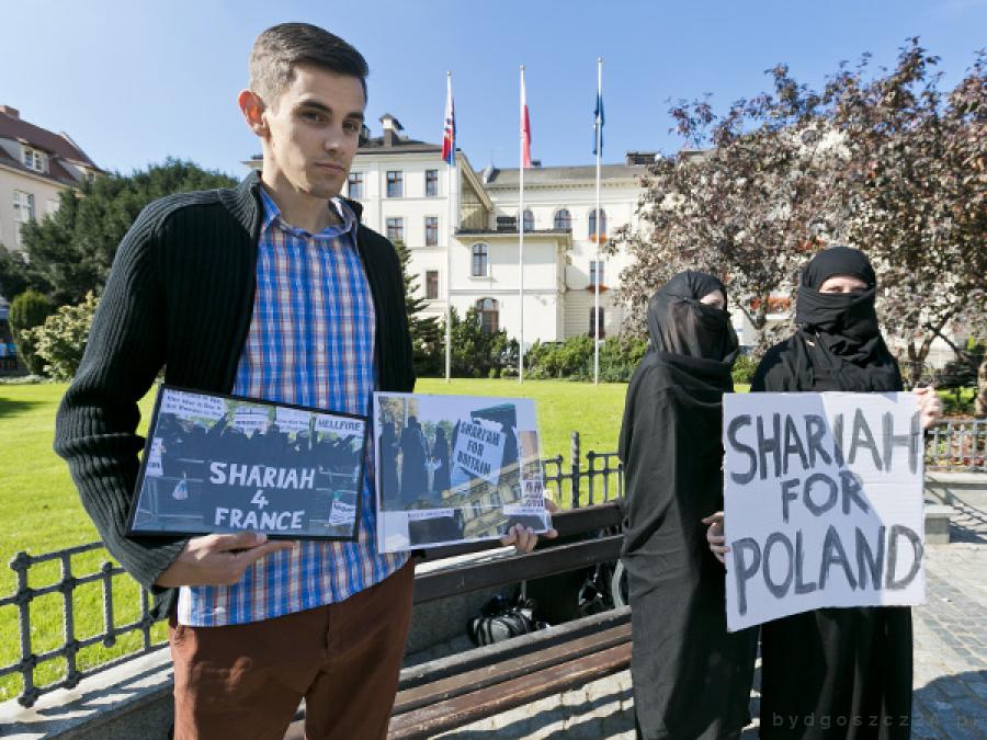 W konferencji na Starym Rynku towarzyszyły Nowakowi dziewczęta, które ubrane były w czarne chusty, zasłaniające twarze niczym muzułmańskie nikaby. Obok przedstawiciel Młodzieży Wszechpolskiej pokazywał zdjęcia grup muzułmanek na ulicach miast we Francji, przestrzegających islamskich praw i zwyczajów, zwracających uwagę, że prawo szariatu może być już niedługo stosowane i u nas.
