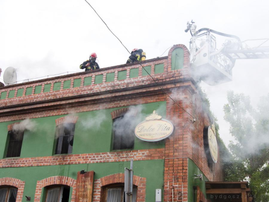 Krótko po godzinie 13 w pizzerii Dolce Vita przy ul. Podwale 2 wybuchł pożar. Ogień zajął I piętro z poddaszem użytkowym.