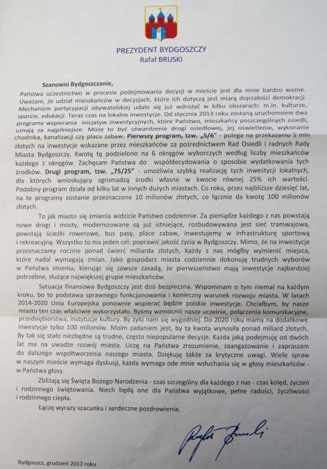 Prezydent Rafał Bruski w zakończeniu tego wątku listu obiecuje, że przez najbliższe 10 lat jest gotów twardo stać w swym postanowieniu w sprawie uczestnictwa mieszkańców w podejmowaniu decyzji dotyczących lokalnych inwestycji w ramach programów 5/6 i 75/25, co przez ten okres pozwoli mieszkańcom zadecydować o wydaniu 100 mln zł na inwestycje z budżetu miasta.