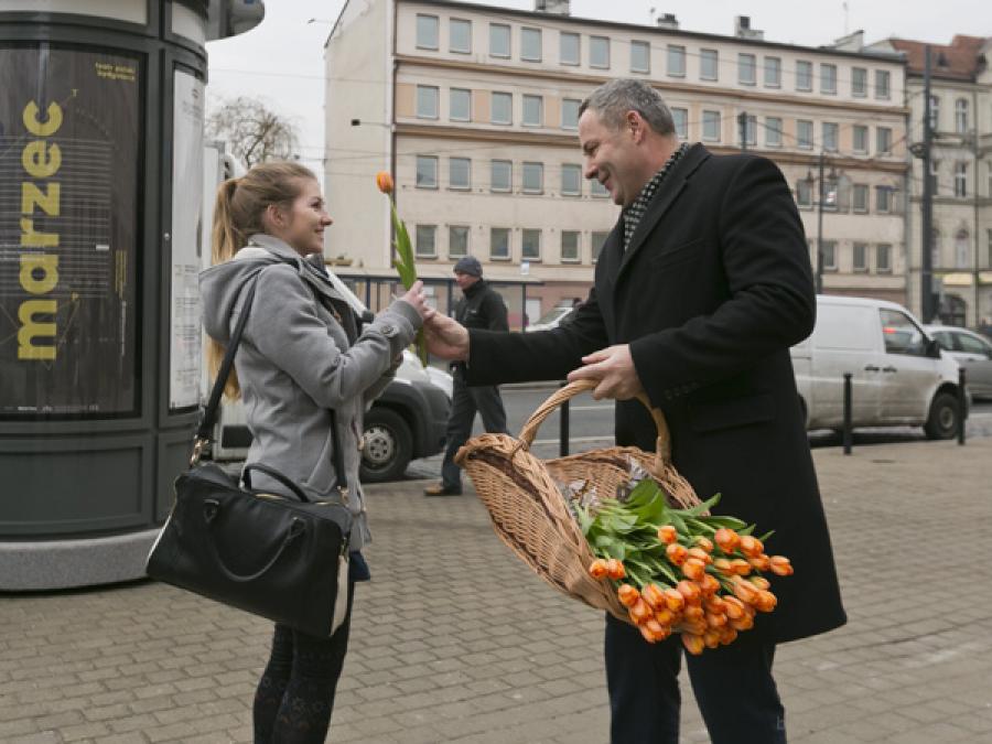 Prezydent Bydgoszczy Rafał Bruski czekał tam na nie z tulipanami, z czekoladkami, z życzeniami i z uśmiechem. Prezydentowi towarzyszyli doradca Michał Sztybel i pełnomocnik ds. utworzenia metropolii Łukasz Krupa.