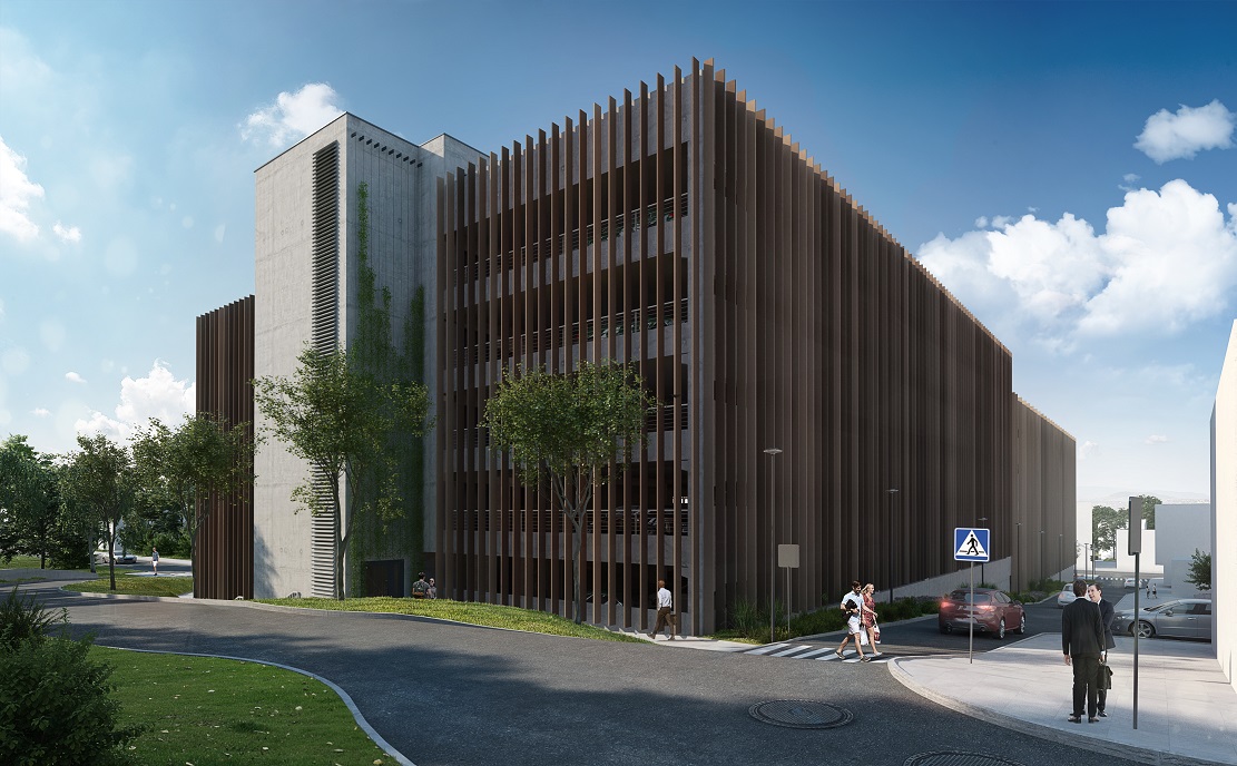 Parking wielopoziomowy typu „Park & Ride” i „Park & Go” będzie liczył 6-kondygnacji. Pomieści 570 pojazdów, w tym 29 dla osób z niepełnosprawnościami. Ze względów konstrukcyjnych i warunków terenowych podzielono go na 2 części. Elewacja budynku utrzymana będzie w kolorze szarym z pionowymi elementami żaluzyjnymi. W centralnym punkcie pojawi się prosty zegar. Ściany budynku zostaną zagospodarowane naturalną zielenią pnącą.