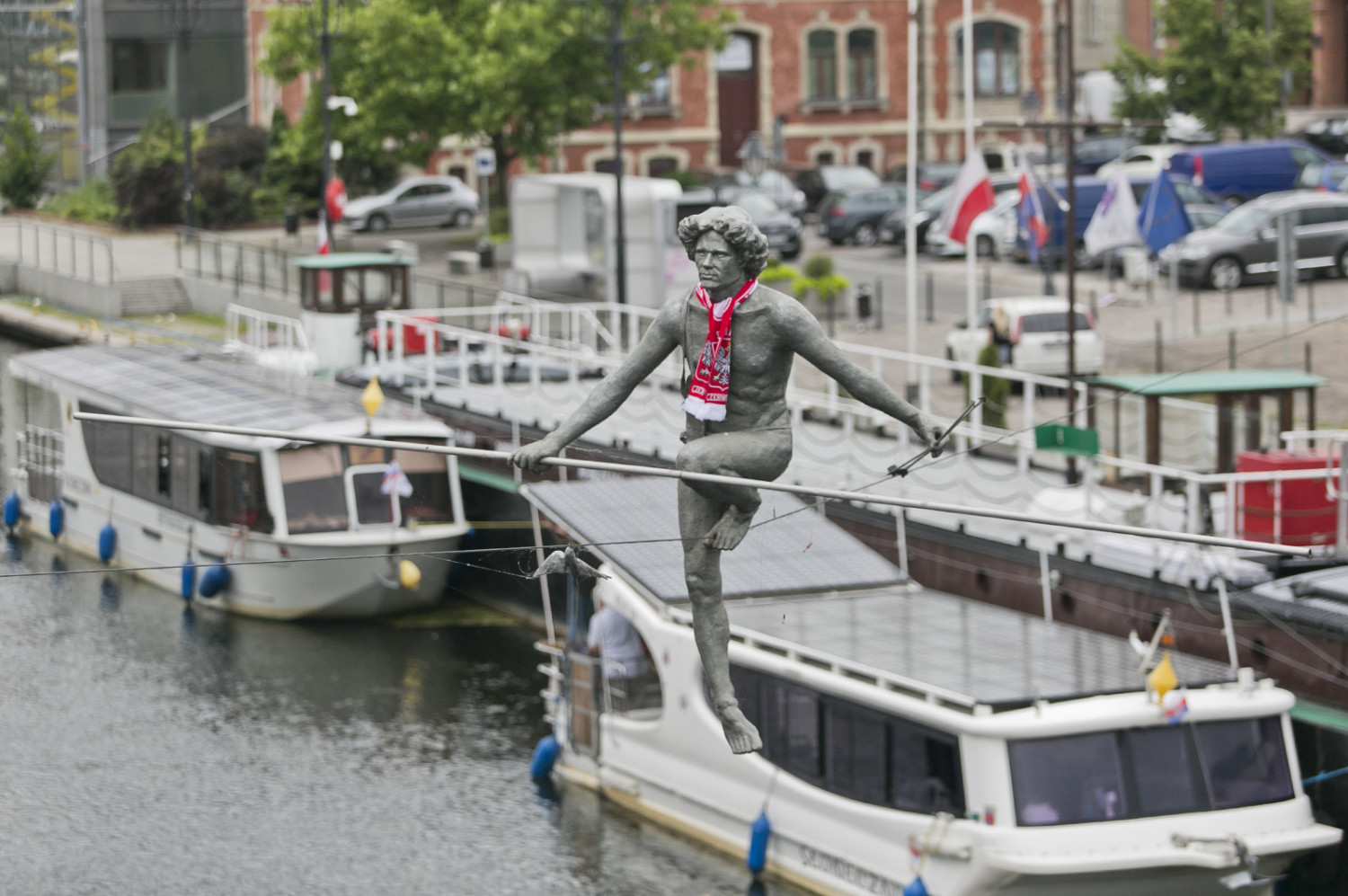 Dzisiaj o godz. 17 biało-czerwoni zagrają pierwszy mecz na mistrzostwach świata w piłce nożnej w Rosji. Mundialowa gorączka dotknęła również "Przechodzącego przez rzekę". Przechodnie patrzą dzisiaj na niego z troską. Żeby tylko biedaczek nie stracił równowagi, jak biało-czerwoni szturmować będą bramkę Senegalu lub, co gorsza, gdy Senegalczycy szturmować będą bramkę Szczęsnego. Wtedy niech Wojtkowi Szczęsnemu dopisuje szczęście!