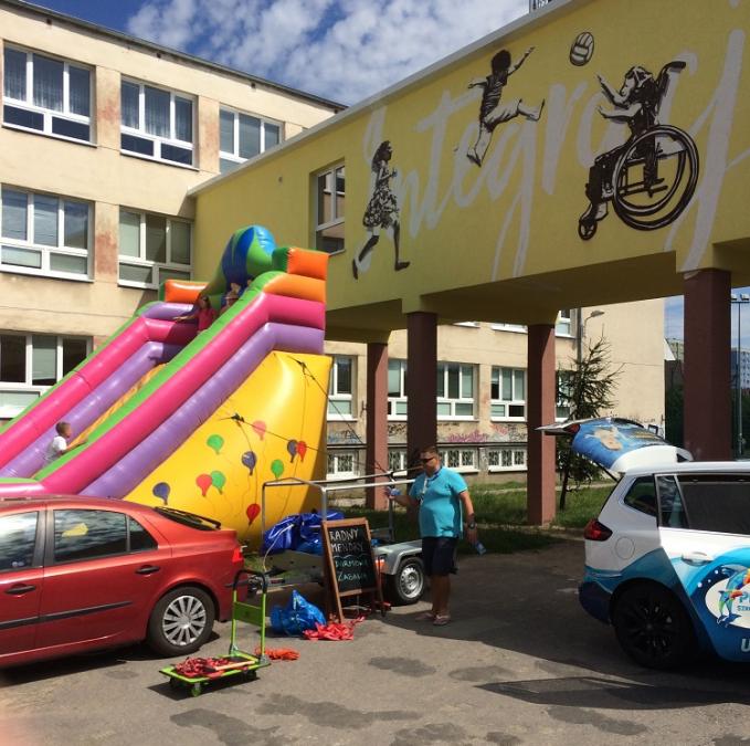 Przed wejściem do budynku szkolnego przy ul. Grzymały Siedleckiego znajduje się dmuchana zjeżdżalnia, a przy niej tablica z napisem: radny Mendry darmowa zabawa.