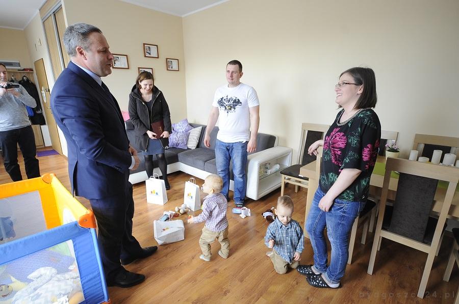 Pierwszy wniosek w ramach programu ?Rodzina 500 plus? w bydgoskim urzędzie miasta złożyli państwo Patrycja i Rafał Czerwińscy ? rodzice bydgoskich czworaczków. Do nich udał się dzisiaj z pierwszą decyzją o przyznaniu świadczenia prezydent Rafał Bruski.