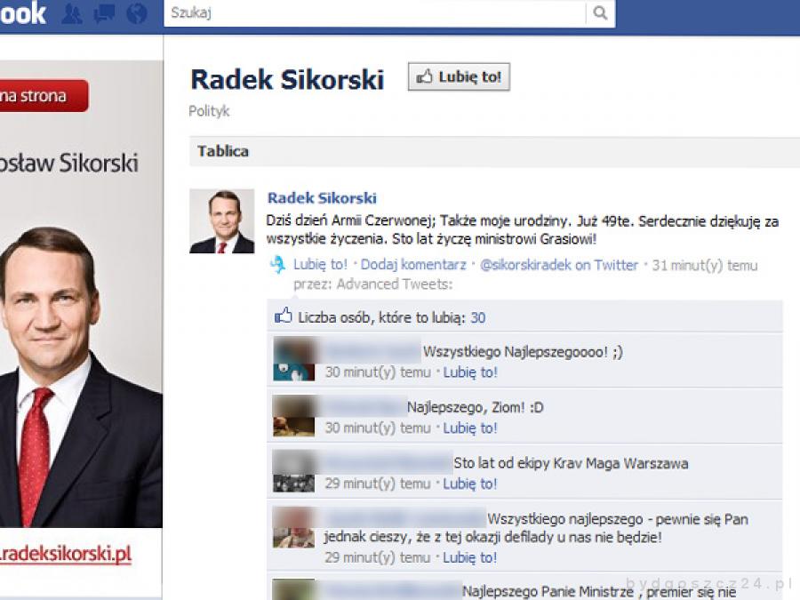 Na oficjalnym profilu Radosława Sikorskiego na Facebooku i Twitterze pojawił się dzisiaj wpis: “Dziś dzień Armii Czerwonej; Także moje urodziny. Już 49te. Serdecznie dziękuję za wszystkie życzenia. Sto lat życzę ministrowi Grasiowi!”.