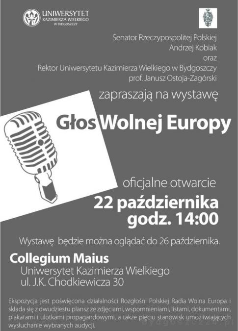 W Colegium Maius Uniwersytetu Kazimierza Wielkiego będzie można od poniedziałku oglądać wystawę poświęconą działalności Rozgłośni Polskiej Radia Wolna Europa. Ekspozycja składa się z dwudziestu plansz ze zdjęciami, wspomnieniami, listami, dokumentami, plakatami i ulotkami propagandowymi, a także pięciu stanowisk umożliwiających wysłuchanie wybranych audycji.