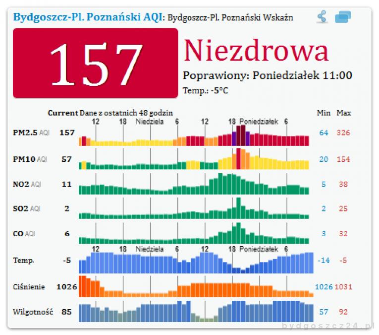 Oprócz danych o stanie środowiska publikowanych na stronie bydgoskiego WIOŚ można też śledzić mapę wizualną jakości powietrza w czasie rzeczywistym według Wartości Indeksu Jakości Powietrza (AQI). Według publikowanego dzisiaj raportu z godz. 11 powietrze w Bydgoszczy na stacji Plac Poznański określane było jako “niezdrowe”, w którym “każdy może zacząć doświadczać negatywnych skutków zdrowotnych, a u osób wrażliwych mogą wystąpić poważniejsze skutki zdrowotne”.