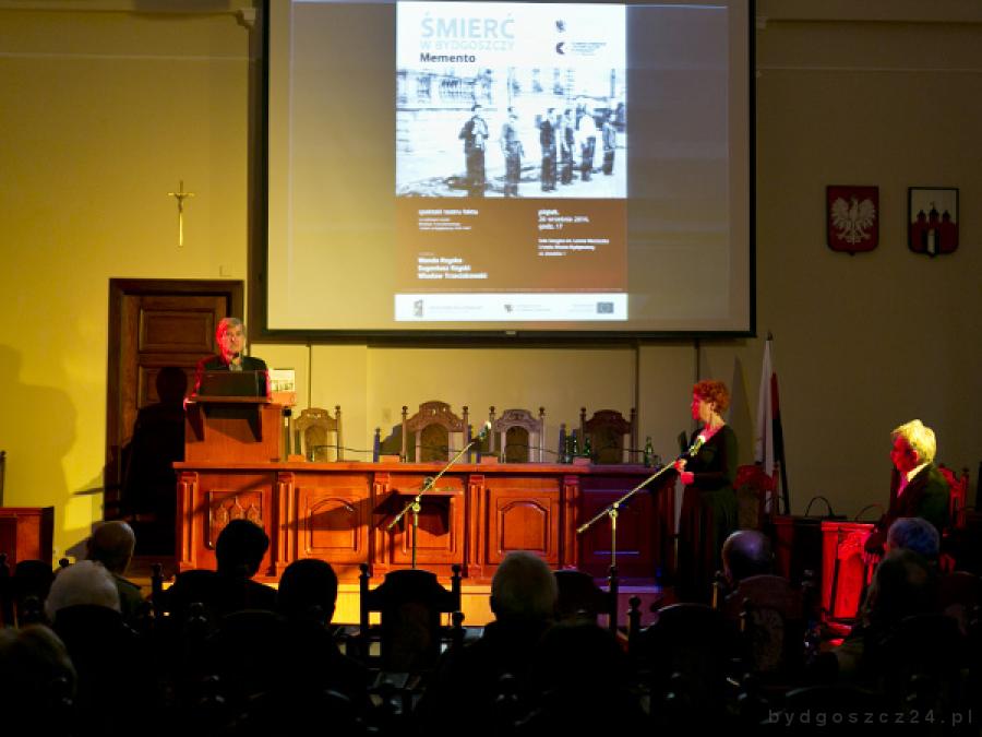 Spektakl “Śmierć w Bydgoszczy – Memento” w sali sesyjnej ratusza zagościł na zaproszenie przewodniczącego Rady Miasta Romana Jasiakiewicza. Przedstawienie powstało w oparciu o najnowszą książkę Wiesława Trzeciakowskiego pt. ?Śmierć w Bydgoszczy 1939-1945?. Zorganizowane zostało przez Kujawsko-Pomorskie Centrum Kultury.
