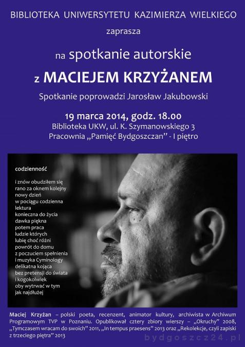 Maciej Krzyżan (ur. 1965 w Namysłowie) ? polski poeta, recenzent, animator kultury, archiwista w Archiwum Programowym TVP w Poznaniu. Od 1978 r. mieszka w Gnieźnie. Jest absolwentem filologii polskiej UAM. Wiersze drukował m. in.: w ?Czasie Kultury?, ?Toposie?, ?Odrze? i ?Zeszytach Poetyckich?. Zadebiutował na IV Piastowskim Lecie Poezji (1982) wygrywając Turniej Jednego Wiersza, w jury m.in. Krzysztof Kuczkowski i Piotr Kuncewicz. W 1981 współzałożyciel i członek Poetyckiej Grupy Efektystów, działającej do 1986 r. Opublikował cztery zbiory wierszy ? ?Okruchy? 2008, ?Tymczasem wracam do swoich? 2011, ?In tempus praesens? 2013 oraz ?Rekolekcje, czyli zapiski z trzeciego piętra? 2013.