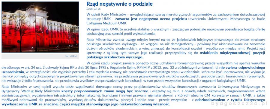 W związku z publikacją nieprawdziwych informacji na oficjalnej stronie internetowej Uniwersytetu Mikołaja Kopernika na temat rzekomego stanowiska rządu w sprawie utworzenia Uniwersytetu Medycznego w Bydgoszczy, oczekuję od Pana Rektora publicznego wyjaśnienia celowości wprowadzania w błąd opinii publicznej. Takim działaniem podważa Pan wiarygodność swoją, jak i uniwersytetu, którym Pan kieruje.