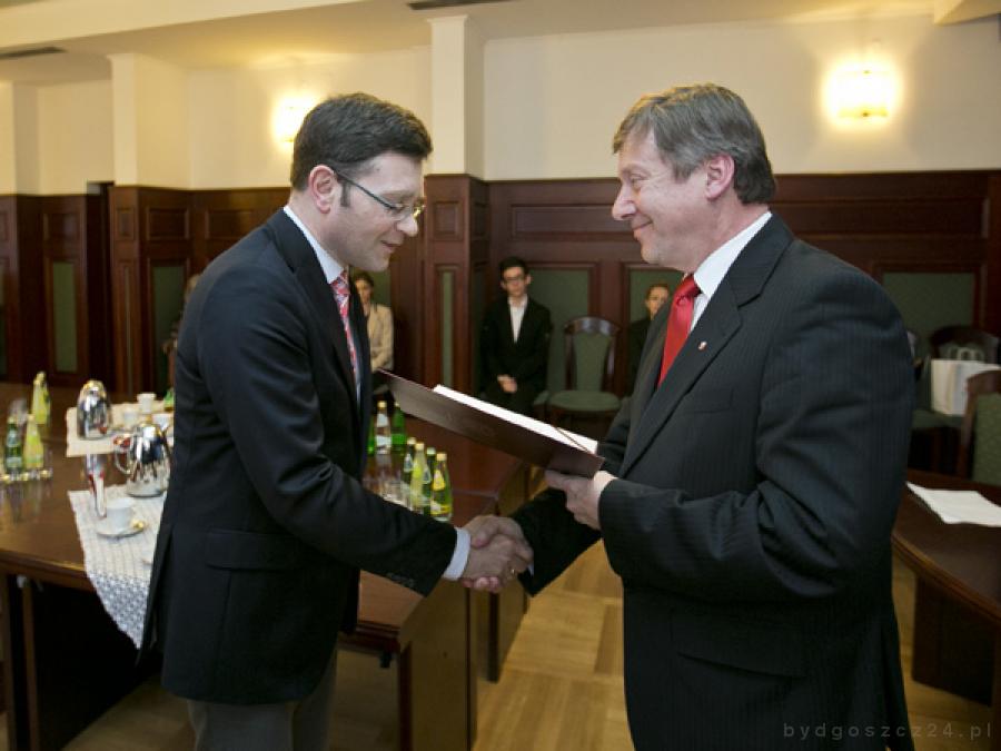 Po części artystycznej nastąpiła część oficjalna. – Mam zaszczyt powitać wszystkich tych, którzy w naszym mieście tworzą teatr. Serdecznie dziękuję artystom, którzy przyczyniają się do tworzenia znakomitych spektakli zarówno w Teatrze Polskim, Operze Nova, teatrze lalkowym w MCK-u, jak i młodzieży. Jest to tak. Pisarz, poeci przekazują nam słowa, ale żeby te słowa stały się jeszcze piękniejsze potrzebne są przedstawienia. Przedstawienia, które tworzą reżyserzy, które tworzą aktorzy. Przedstawienia te przechodzą czasami w naszej pamięci do historii i my je wspominamy, odtwarzamy. My te przedstawienia lubimy, uwielbiamy, bo grali w nich ulubieni nasi aktorzy, reżyserowali wspaniali reżyserzy. Chciałbym ludziom bydgoskiego teatru bardzo serdecznie podziękować – powiedział zastępca prezydenta Jan Szopiński. Z jego rąk listy gratulacyjne otrzymali: Maciej Figas – dyrektor Opery Nova w Bydgoszczy, Paweł Łysak – dyrektor Teatru Polskiego w Bydgoszczy, Marzena Matowska – dyrektor Miejskiego Centrum Kultury, Iwona Busz – dyrektor Pałacu Młodzieży. Natomiast nagrodami prezydent Bydgoszczy uhonorował: Tadeusza Szlenkiera ? śpiewaka, solistę, tenora z Opery Nova, Wojciecha Bartczaka ? zastępcę dyrektora ds. inwestycyjnych Opery Nova, Zofię Domagałę ? z Opery Nova, Julię Wyszyńską – aktorkę Teatru Polskiego w Bydgoszczy, Bernadetę Fedder – kierownika Działu Artystycznego w Teatrze Polskim w Bydgoszczy, Jakuba Ulewicza – aktora Teatru Polskiego w Bydgoszczy, Waldemara Gracza – kierownika Działu Techniczno-Gospodarczego Teatru Polskiego w Bydgoszczy,
