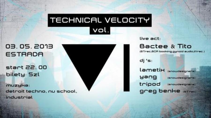 Technical Velocity to cykl imprez odbywających się rzadko ? jednak przyciągający tłumy fanów muzyki techno. Podobnie jak na poprzednich odsłonach – na dwóch scenach wystąpią reprezentanci gatunków, takich jak detroit techno, nu-skull i industrial. Znani z poprzednich edycji poznaniacy Tito & Bacte zaprezentują na scenie techno swój live act. Na drugiej sali zagrają DJ-e: Lametix, Yang i Tipod, tworzący skład Snowdesigners, zaś wesprze ich Greg Benke (BT rec).