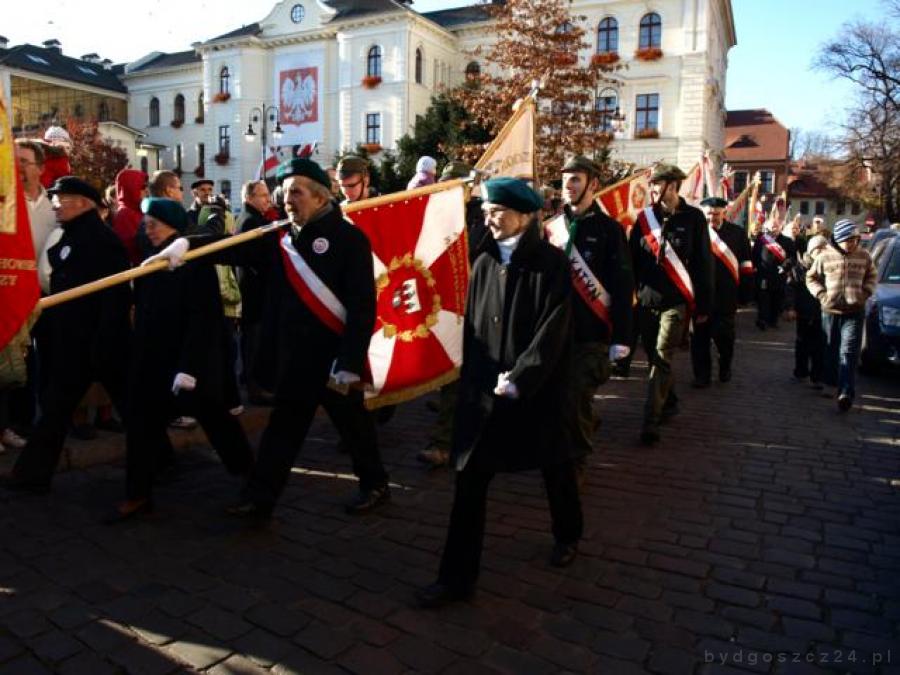 Po Mszy św. ze Starego Rynku wyruszył pochód na plac Wolności. Tak licznego przemarszu Bydgoszcz nie widziała już dawno. Na czele spontanicznego marszu szli wojewoda kujawsko-pomorski Ewa Mes i prezydent Bydgoszczy Rafał Bruski, posłowie Tomasz Latos, Teresa Piotrowska, Paweł Olszewski, senator Andrzej Kobiak, radni, liczne poczty sztandarowe, oddziały wojska, przedstawiciele szkół, bractw i cechów. Najbardziej widowiskowo prezentowali się kibice Zawiszy z flagą klubu i lasem proporczyków w barwach narodowych.