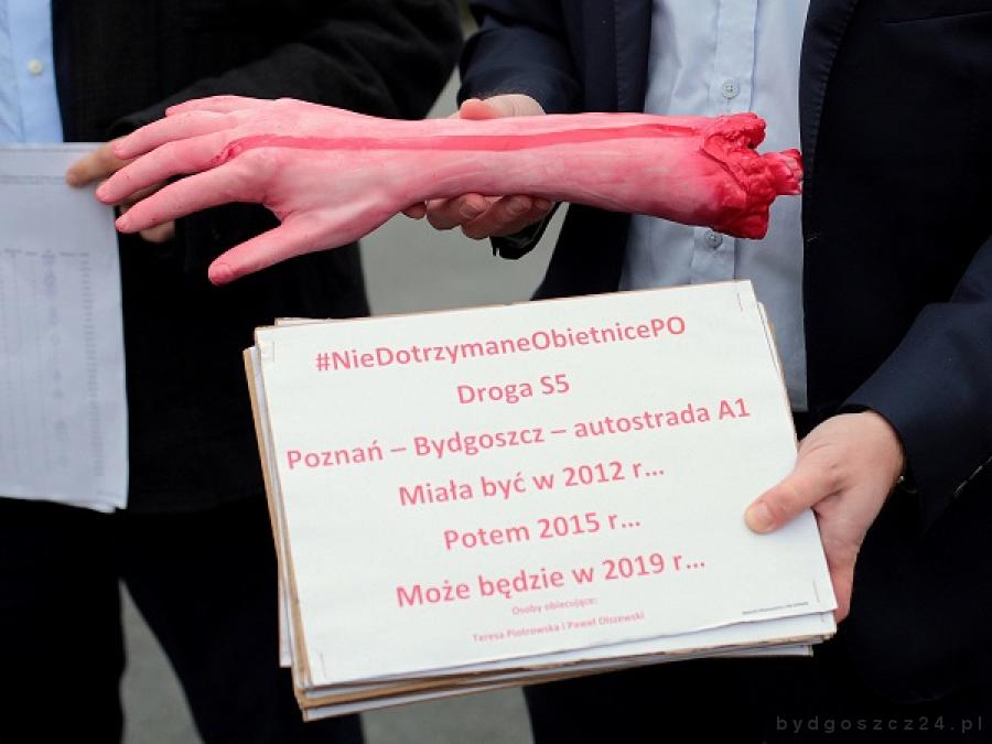 - Nieprzypadkowo spotykamy się na placu Teatralnym. Tutaj miała powstać dosyć ciekawa inwestycja, której budowa miała być dotowana z budżetu państwa. Swego czasu minister Zdrojewski chciał przekazać 250 mln zł na zagospodarowanie placu i budowę wielofunkcyjnego obiektu, który mógł służyć dla festiwalu “Camerimage”. Jak widzimy do dzisiaj nic się nie zmieniło. Podobnie wyszło z zamiarem odchudzenia administracji, obniżenia podatków – powiedział Stadnicki i dodał: – Budowa drogi S5 najpierw miała być ukończona do 2012 roku, potem do 2015, a teraz się mówi, że ma powstać do końca 2019 roku. Swego czasu pan poseł Olszewski obiecał, że da sobie rękę uciąć, jeśli ta droga nie powstanie zgodnie z harmonogramem, czyli do końca 2015 roku. Żeby nie musiał się porwać do tak drastycznych kroków, przygotowaliśmy dla niego uciętą rękę, którą mógłby wykorzystać i chociaż tę jedną obietnicę Platformy spełnić i pokazać tę rękę wyborcom.