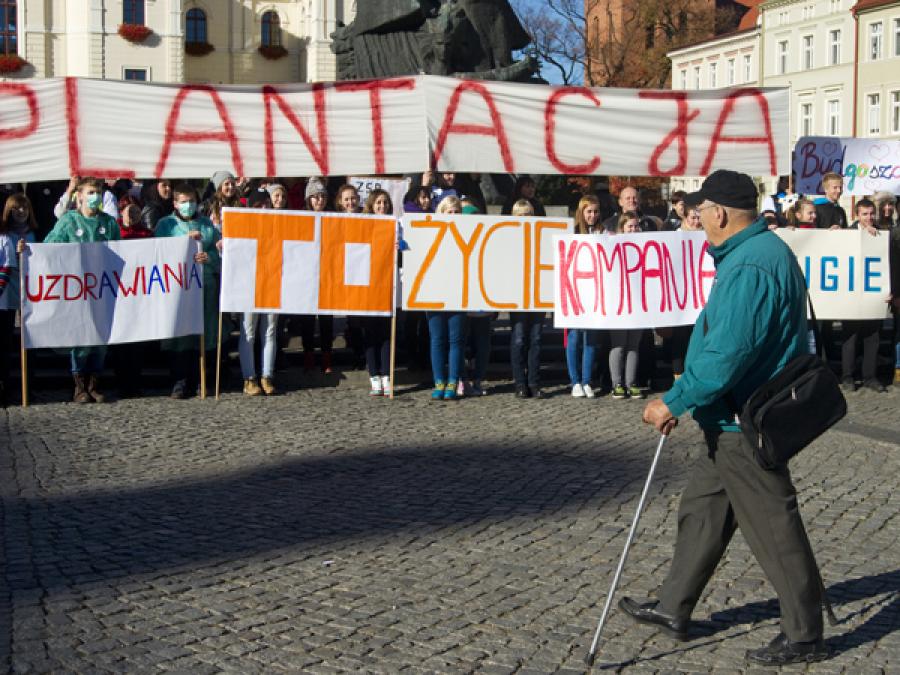 W same południe pojawiła się na Starym Rynku liczna grupa młodzieży z wielkim transparentem z napisem TRANSPLANTACJA. Byli to uczestnicy akcji z okazji Światowego Dnia Donacji i Transplantacji, która jest organizowana w kraju po raz piąty, a po raz pierwszy w województwie kujawsko-pomorskim.