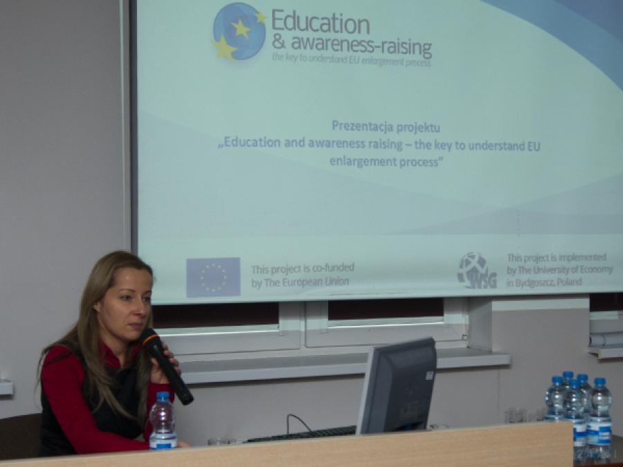 - Istotą konferencji jest podnoszenie wiedzy i świadomości obywateli UE dotyczące szans i zagrożeń, płynących z poszerzania Unii – powiedziała mgr Dagmara Taflińska z WSG, dokonując prezentacji projektu. Zakłada on szereg przedsięwzięć propagujących wiedzę o procesie rozszerzenia Unii. – Mieliśmy bardzo fajne doświadczenie ze współpracy z dwoma tureckimi uniwersytetami. Najpierw byliśmy w Turcji, a potem oni przyjechali do nas – dodała. W maju w Warszawie na ten temat odbyła się konferencja ekspercka, a w 20 miastach odbywa się euroquiz. Aktualnie trwa sesja warsztatów w Polsce, w tym właśnie u nas w Bydgoszczy. – Całość zakończy seria konferencji od Portugalii do Finlandii i powstanie specjalna publikacja – zakończyła prezentację projektu.