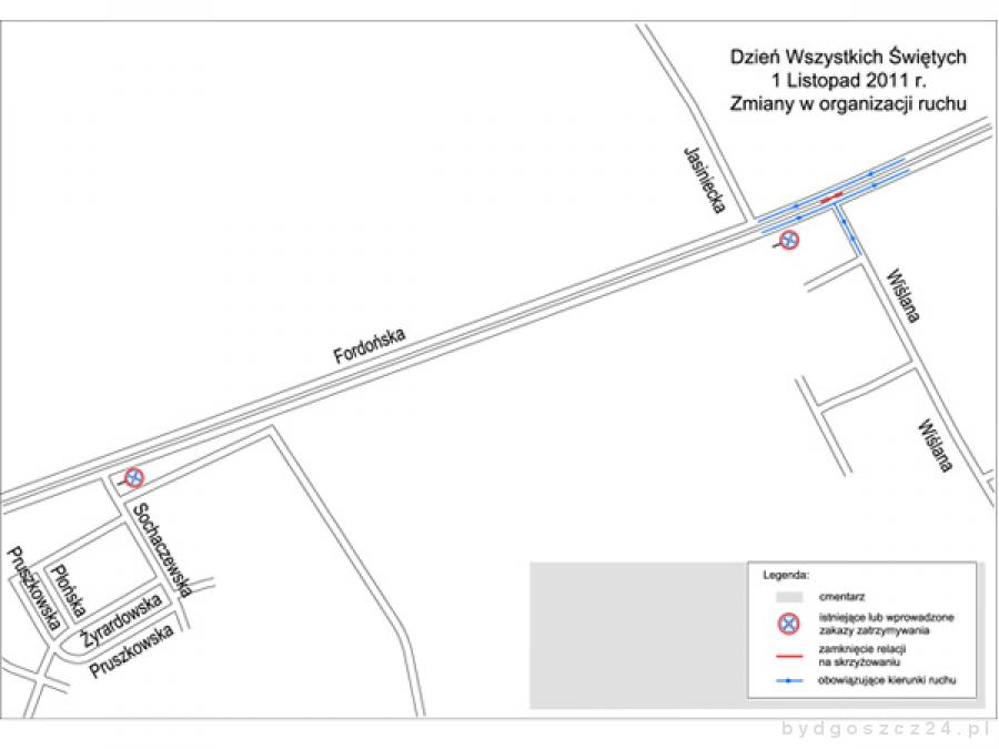 Utrzymanie zakazu zatrzymywania się na ul. Artyleryjskiej; czasowa likwidacja ścieżki rowerowej na ul. Pileckiego, ul. Artyleryjskiej, ul. Zaświat i ul. Zygmunta Augusta; wprowadzenie zakazu zatrzymywania się na ul. Rynkowskiej (po obu stronach jezdni na odcinku od skrzyżowania z ul. Pileckiego do drogi wzdłuż bocznicy kolejowej); wprowadzenie zakazu zatrzymywania się po obu stronach jezdni wzdłuż bocznicy kolejowej (wzdłuż północnego ogrodzenia cmentarza); wprowadzenie zakazu zatrzymywania się na ul. Ludwikowo (po obu stronach jezdni, odcinek od łącznika przy cmentarzu do tymczasowego parkingu); wyłączenie z ruchu odcinka ul. Ludwikowo od łącznika przy cmentarzu do wjazdu do Pesy; wyznaczenie tymczasowego parkingu w okolicy północnej bramy cmentarza)