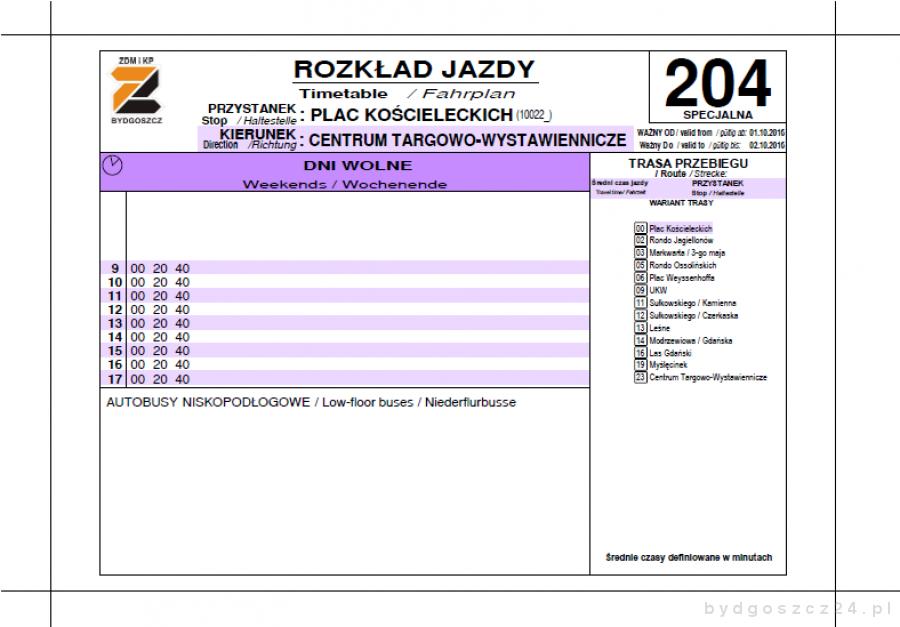 Odwiedzający będą mogli skorzystać ze specjalnej linii autobusowej, która kursować będzie z placu Kościeleckich bezpośrednio do Bydgoskiego Centrum Targowo- Wystawienniczego. Rozkład jazdy specjalnej linii nr 204 powyżej.