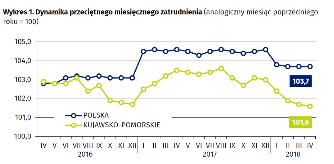Województwo kujawsko-pomorskie w kwietniu 2018 roku pod względem dynamiki przeciętnego zatrudnienia w stosunku do ub. roku zajęło ostatnie miejsce w rankingu województw. Największy wzrost zatrudnienia wystąpił w województwie wielkopolskim (o 6,6%) i pomorskim (o 6,5%).