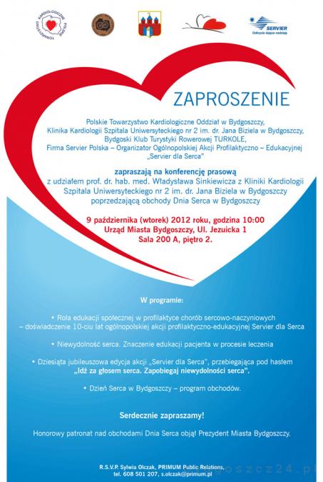 Ogólnopolska akcja ?Servier dla serca? ma na celu podniesienie świadomości społecznej na temat chorób serca i czynników je wywołujących. Tegoroczna akcja będzie przebiegać pod hasłem: ?Idź za głosem serca. Zapobiegaj niewydolności serca.? Na bydgoskim rynku stanie kardiobus, w którym w godzinach od 9:00 do 18:00 będzie można zrobić bezpłatne badania: masy ciała (wskaźnika BMI), ciśnienia tętniczego krwi, stężenia glukozy i cholesterolu, EKG serca, dokonać konsultacji kardiologicznej. Stanie również namiot, w którym uczestnicy akcji będą mogli otrzymać materiały edukacyjne, wziąć udział w konkursach z nagrodami, a także wypełnić Serdeczną Deklarację ? symboliczny dokument zobowiązujący do wyeliminowania choć jednego, wybranego czynnika ryzyka w chorobach układu sercowo-naczyniowego. Za każdą wypełnioną deklarację firma Servier wpłaci 5 złotych na fundację Serce Dziecka.