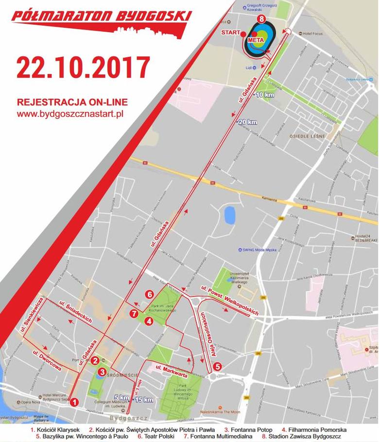 Trasa biegu. Start nastąpi na stadionie Zawiszy przy ul. Gdańskiej. Uczestnicy pobiegną dwukrotnie pętlą, która prowadzić będzie ulicami: Gdańską. Śniadeckich, Sienkiewicza, Dworcową, ponownie Gdańską, nawrót przed Jagiellońską i powrót Gdańską, Krasińskiego, Gimnazjalną, Skargi, 3 Maja, Markwarta, Sielanką, Miłosza, Kopernika, Paderewskiego, Mickiewicza, pl. Weyssenhoffa, Ossolińskich, pl Weyssenhoffa, Powstańców Wlkp., pl. Weyssenhoffa, Mickiewicza, 20 Stycznia, Słowackiego, Gdańską do bramy stadionu. Jednocześnie odbędzie się bieg na 5 km, którego trasa prowadzi po części pętli półmaratonu.