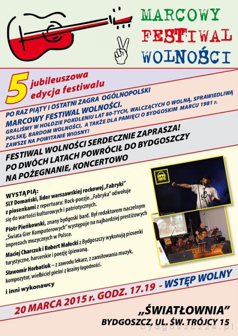 Festiwal odbył się po raz pierwszy w marcu 2010 r. w Bydgoszczy jako hołd dla pokolenia Polaków walczących w latach 80. ub. wieku o wolną Polskę, hołd dla bardów wolności i bydgoszczan Marca 1981 r., a także jako coroczne przywitanie wiosny. Gościł wielu artystów, przybywających z różnych miejsc naszego kraju, w tym laureatów ogólnopolskich i międzynarodowych festiwali. W piątej, pożegnalnej edycji wystąpi m.in. lider warszawskiego zespołu rockowego ?Fabryka?, Sly Domański.