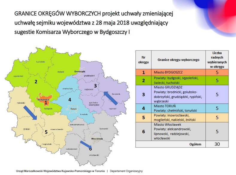Pierwszą uchwałę w tej sprawie sejmik przyjął 28 maja. Zastrzeżenia do przyjętego podziału na okręgi wyborcze wyraził komisarz wyborczy w Bydgoszczy. Projekt uwzględniający uwagi komisarza radni zatwierdzili na poniedziałkowej sesji.