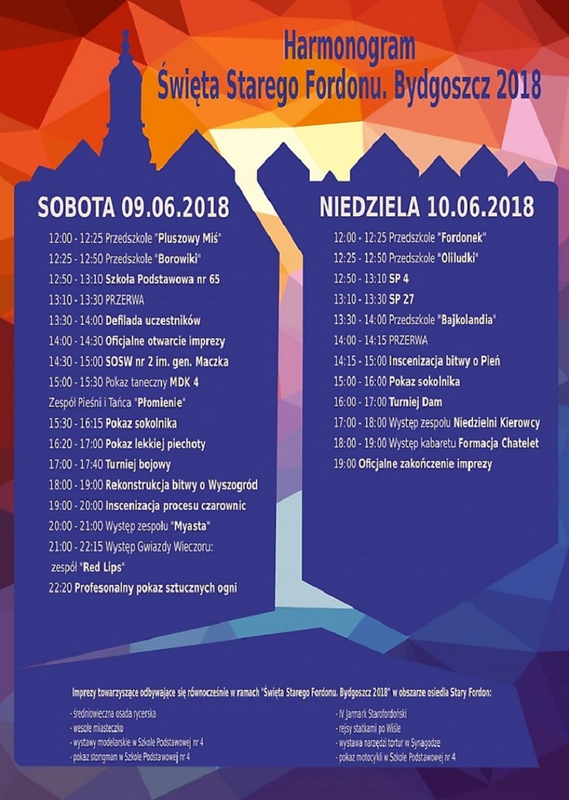 Najważniejszym co roku wydarzeniem podczas Święta Starego Fordonu jest rekonstrukcja ważnego epizodu z dziejów oręża polskiego. W sobotę o godzinie 18.00 zrekonstruowana zostanie bitwa o Wyszogród z 1330 roku. Okrutni Krzyżacy blisko 700 lat dokonali wielu zniszczeń, ale polscy rycerze nawałę będą dzielnie odpierać. Po bitwie, ok. godz. 19.00 odbędzie się sąd czarownic. Wieczór zakończy koncert zespołu Red Lips i pokaz sztucznych ogni.