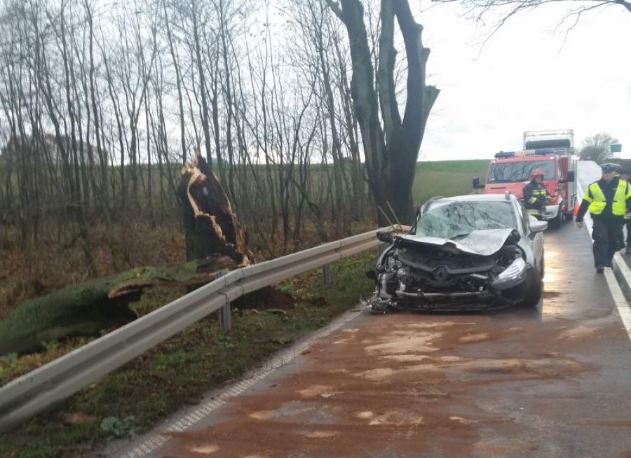Na przejeżdżające dwa pojazdy przewróciło się drzewo. Przybyli na miejsce policjanci zastali jedną kierującą samochodem renault megane na miejscu wypadku, natomiast kierującą drugim pojazdem pogotowie zabrało do szpitala. Na szczęście po przeprowadzeniu badań lekarskich, okazało się, że kobieta nie odniosła poważniejszych obrażeń.