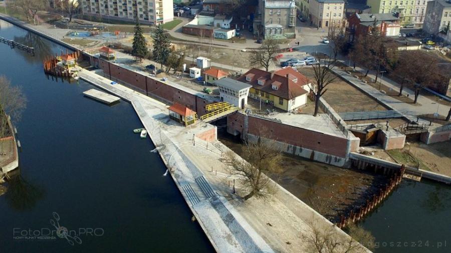 Kamera na latającej platformie firmy FotoDron.PRO dokonała przedświątecznego zwiadu dronowego i udokumentowała próby przeprowadzenia wiosennych porządków. Remontowi, a właściwie zewnętrznemu liftingowi, poddawane są młyny Rothera. Po drugiej stronie Brdy wynurza się z wody jakaś dziwna scena, doklejka do bulwarów, przed amfiteatrem Opery Nova.