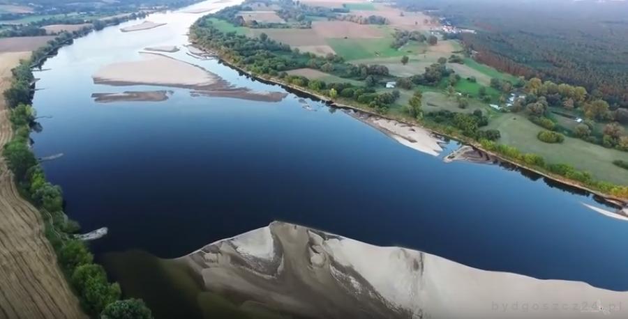 Poziom wody na Wiśle śledzi też tego lata kamera latającej platformy firmy FotoDron. Na filmie można zauważyć miejsca, gdzie można Wisłę przejść niemal na piechotę.