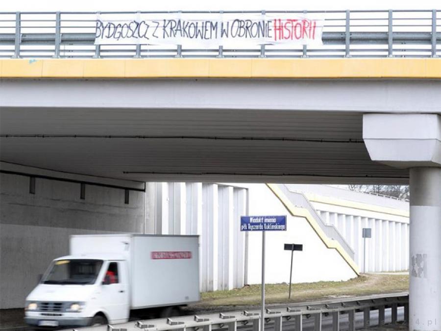 W Bydgoszczy, na wiadukcie płk Ryszarda Kuklińskiego zawisł transparent z hasłem “Bydgoszcz z Krakowem w obronie historii”. W tym samym miejscu wisiał przed kilkoma tygodniami transparent “Tusk odpowiesz za Smoleńsk”. Nie udało nam się ustalić autora (autorów?) tego nietypowego sposobu komunikacji.