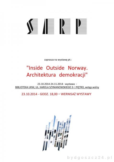 Wystawa “Inside Outside Norway. Architektura demokracji” przybliża współczesną architekturę Norwegii, kraju niezwykle malowniczych krajobrazów, kształtowanego z wielką dbałością o przestrzeń publiczną oraz komfort życia mieszkańców. Omawia zagadnienia związane z kształtowaniem przestrzeni w kraju skandynawskim wyróżniającym się wielką kulturą realizacji zadań publicznych, poruszając następujące tematy: architektura dla demokracji, narodowy akcent, budowanie dla środowiska oraz budowanie z drewna.