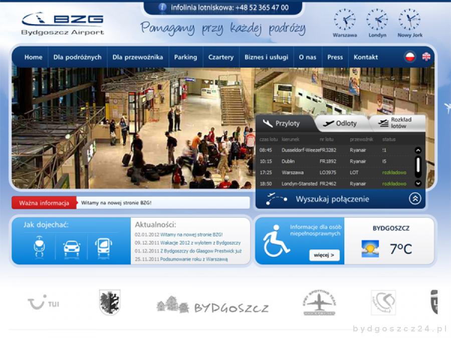Poprzednia strona lotniska odstawała od standardów estetycznych i funkcjonalnych narzucanych przez ostro konkurujące porty lotnicze. Nowa strona (www.bzg.aero) może śmiało uchodzić za jedną z najlepszych w tej branży. Jest czytelna, prosta w obsłudze i funkcjonalna. Internauci chwalą m.in. atrakcyjne zdjęcia. “Wyposażyliśmy witrynę w narzędzia ułatwiające pasażerom korzystanie z naszego lotniska, między innymi kalkulator parkingowy, formularze kontaktowe, formularze awizacyjne, sondy i ankiety, ułatwienia dla osób niepełnosprawnych. Poprawiliśmy czytelność rozkładu lotów oraz możliwość wyszukiwania informacji” – reklamują nową stronę autorzy.