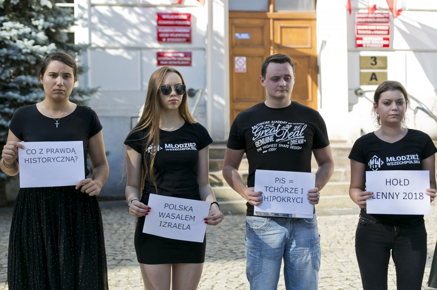 Aktywiści Młodzieży Wszechpolskiej podczas konferencji prasowej na parkingu przed urzędem wojewódzkim skrytykowali nowelizację ustawy o Instytucie Pamięci Narodowej, dokonaną przez parlament w ekspresowym tempie i podpisaną przez prezydenta.