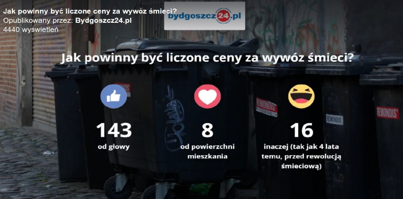 Jeszcze dziesięć dni będą trwały zorganizowane przez ratusz konsultacje w sprawie metody naliczania opłaty za wywóz odpadów. Myśmy wczoraj przeprowadzili sondaż. Zadaliśmy czytelnikom pytanie: Jak powinny być liczone ceny za wywóz śmieci? Możliwości odpowiedzi były trzy: od głowy, od powierzchni mieszkania czy inaczej (tak jak przed „rewolucją śmieciową”).